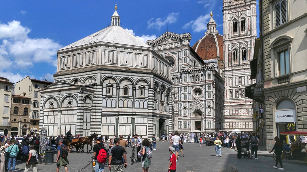 Florenz: Vor dem Dom steht das achteckige, von Brunelleschi im klassichen Renaissancestil errichtete Baptisterium, dessen ursprünglicher Bau jedoch auf das 11. Jahrhundert zurückgeht ... | |