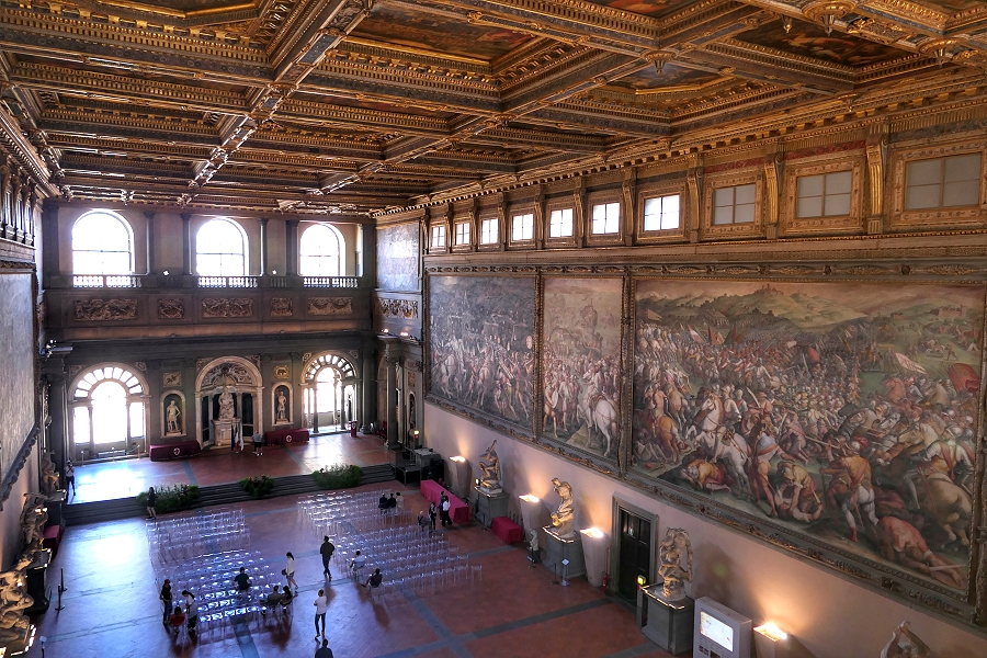 Palazzo Vecchio: Im 16. Jhdt. wurde der 'Saal der Fünfhundert' nach den Vorstellungen von Cosimo I. de Medici (1519-74) vollständig umgestaltet, wobei die z.T. unvollendeten Wandgemälde von Leonardo da Vinci und Michelangelo verlorengingen ... | |