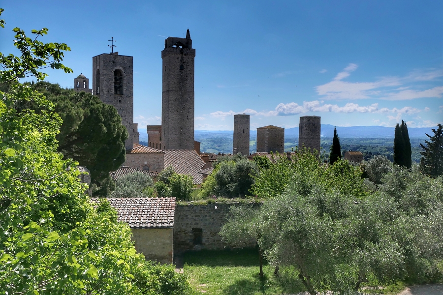 Von der Mauer der Festung Rocca di Montestaffoli hat man einen schönen Blick auf die noch verbliebenen Geschlechtertürme von San Gimignano ... | |