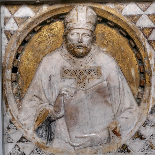 San Gimignano, Sant'Agostino: Marmorrelief eines Bischofs (Tino da Camaino, ca. 1317) ...