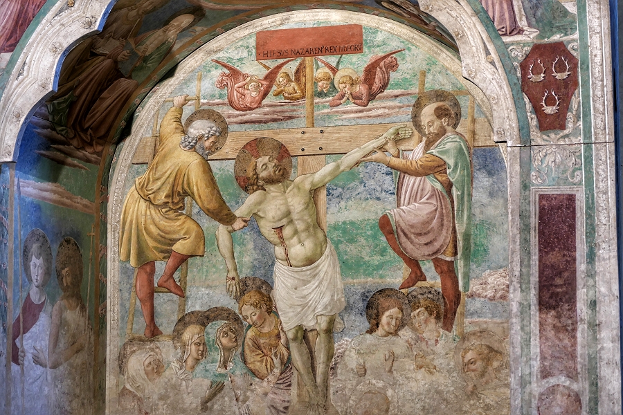 Fresko des Tabernakels von Benozzo Gozzoli (1420-97) in der Kirche Santi Tommaso e Prospero, Certaldo Alto ...