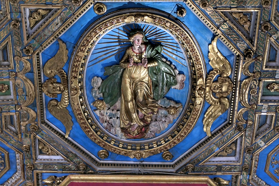 Bemalte und vergoldete Kassettendecke (Detail) der Kathedrale von Volterra aus dem 16. Jahrhundert ...
