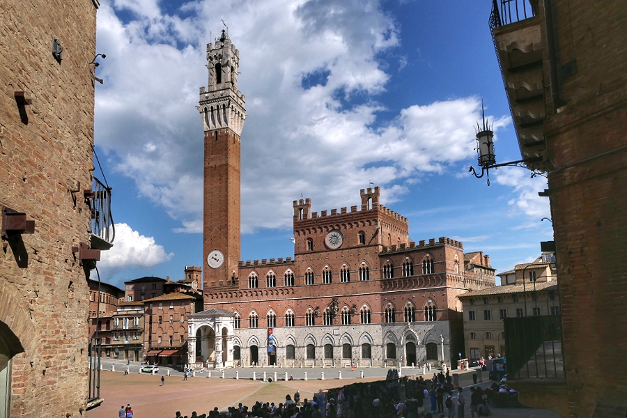 Auf der Südseite der Piazza del Campo liegt der am Ende des 13. Jahrhunderts für den 'Rat der Neun' aus Backsteinen errichtete Palazzo Pubblico ... | |