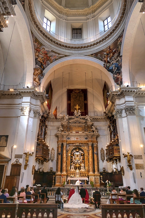 Im Vergleich zur Westfassade wirkt das Innere der Kirche Santa Maria di Provenzano vergleichsweise schlicht, da es abgesehen von den Zwickeln unterhalb der Kuppel keine Ausmalung gibt ...
