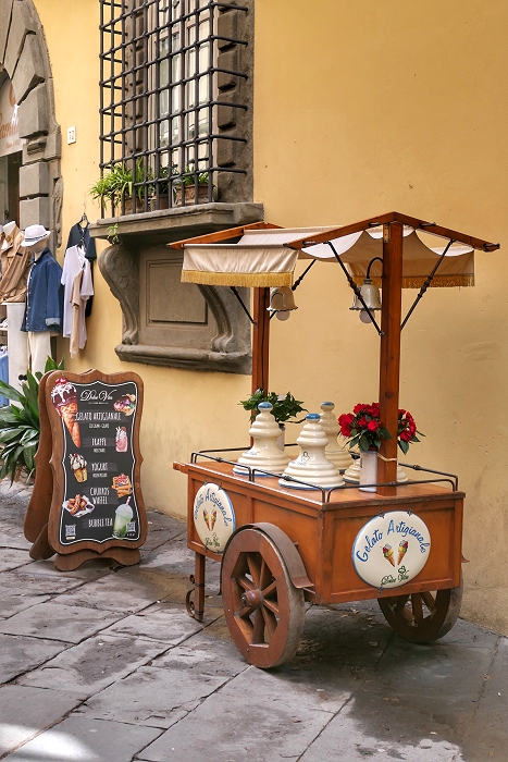 Nostalgischer Eiswagen als Dekoration in der Via Nazionale, Cortona ...