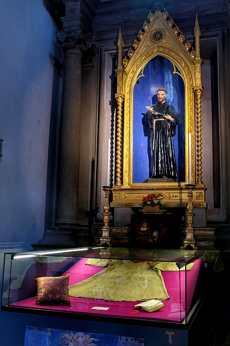 In der linken Seitenkapelle neben dem Hochaltar der Franziskanerkirche von Cortona werden die Reliquien des heiligen Franziskus (sein Habit, das Sterbekissen von Jacopa di Settesoli und sein Evangeliar) aufbewahrt ...