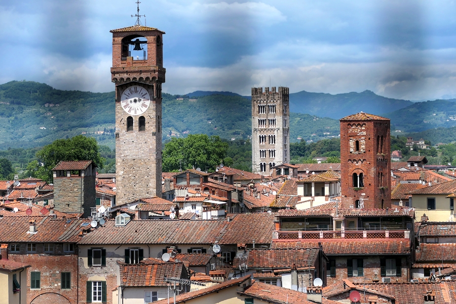 Lucca: Blick vom Turm der Basilika San Giovanni auf den 'Torre delle Ore', den Turm der Basilika San Frediano und den Turm der Kirche San Cristoforo ... | |