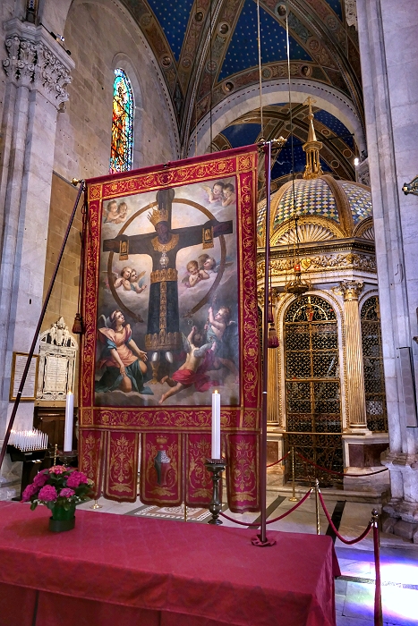 Fahne mit einer Abbildung des 'Volto Santo', einem Holzkreuz, das