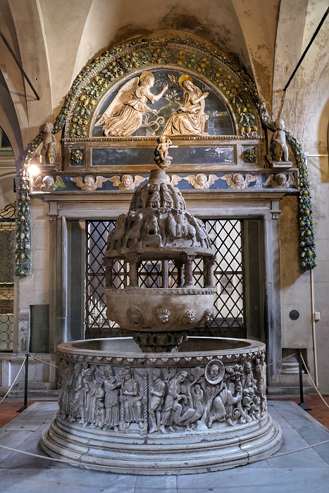 Basilika San Frediano, Lucca: Taufbrunnen aus dem 12. Jahrhundert, dahinter ein Terrakotta-Relief der Verkündigung Mariens aus der Schule della Robbias, 15. Jahrhundert ...