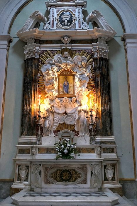 Basilika San Frediano, Lucca: Altar der Gentili-Kapelle mit dem Fresko 'Madonna della Speranza' aus dem 16. Jahrhundert, ursprüngich in einem Bildstock an der Via Anguillara ...