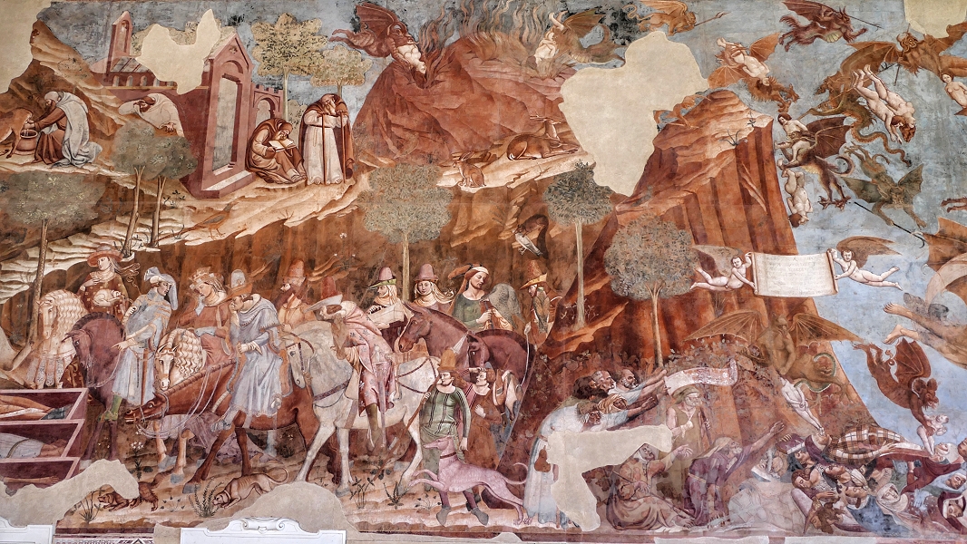 'Campo Santo', Freskenzyklus 'Triumph des Todes': Eine Gruppe von Adligen zu Pferde begegnet in einer düsteren Vision Leichen in verschiedenen Stadien der Verwesung, die von einem Eremiten bewacht werden (um 1340) ... | |