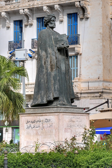 Vor der Kathedrale erinnert eine Statue an den Historiker und Politiker Ibn Chaldūn (1332-1406), den wohl berühmtesten Bürger der Stadt Tunis ...