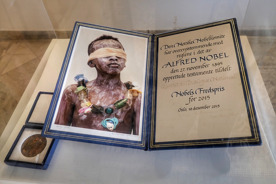 Im Foyer des Bardo-Museums ist der Friedensnobelpreis ausgestellt, der 2015 dem 'Tunesischen Quartett für nationalen Dialog' für seine Bemühungen, nach dem 'Arabischen Frühling' eine Demokratie in Tunesien zu etablieren, verliehen wurde ... | |