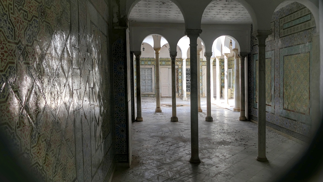 Hinter der unscheinbaren Fassade des Habiba Msika Hauses liegt ein eleganter Patio mit schlanken Säulen und farbigen, glänzenden Wandfliesen ... | |