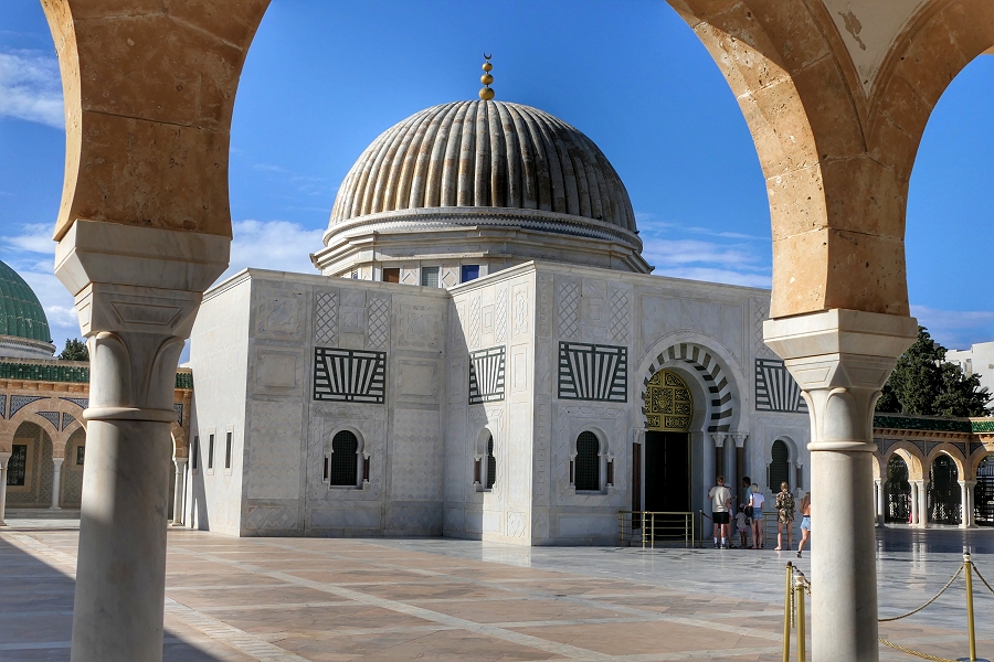 Der von einer (ehemals goldenen) Kuppel überdachte Zentralbau des Mausoleums beherbergt Habib Bourguibas Sarkophag ...