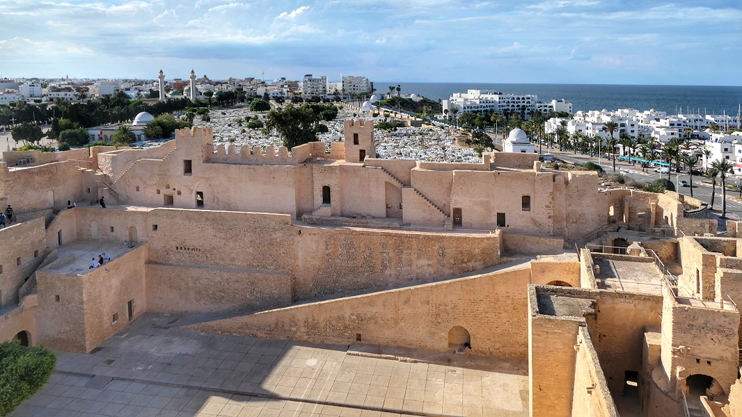 Blick von Wehrturm des Ribat von Monastir in nordwestliche Richtung auf den Sidi El Mezri Friedhof und die Corniche ...