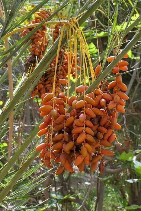 Die Datteln wachsen in großen Trauben an den Palmen ...