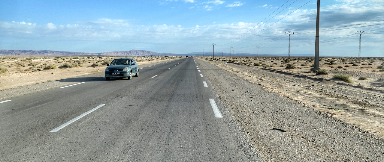 Die gut ausgebaute Landstraße zwischen Tozeur und Metlaoui verläuft über weite Strecken schnurgerade ...