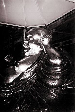 Vor der Haupthalle Dai Hung der Pagode sitzt in einer Vitrine die Messingstatue des lachenden, dickbäuchigen Buddha Di Lac ...
