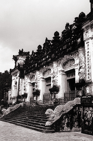 Das Hauptgebäude der Grabanlage für Kaiser Khai Dinh, der Thien Dinh Palast, wirkt mit seiner überreichen Dekoration wie ein vietnamesisches Disneyland ...