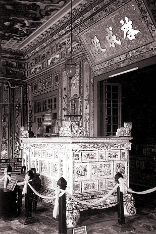 Boden, Wände und Decken des Thien Dinh Palastes sind mit einer verwirrenden Vielfalt unterschiedlicher Materialien, Farben und Motive geschmückt. So wurden die Wände mit Tausenden bunter Glasscherben verziert, die Blumen darstellen sollen ...
