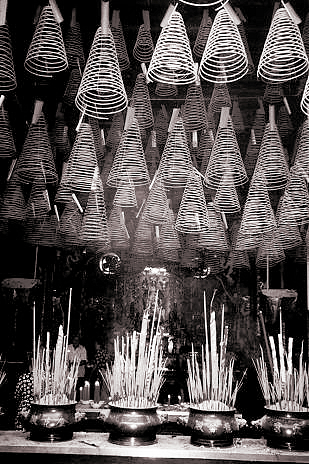 Eine besondere Attraktion der Chua Thien Hau Pagode sind die langen, von der Decke hängenden Räucherspiralen, in deren Schwaden sich das einfallende Sonnenlicht bricht ...