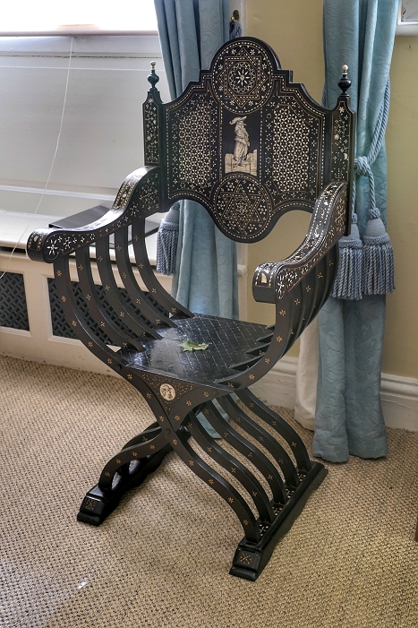 Kiplin Hall: Savonarola-Stuhl aus Ebenholz mit Elfenbein-Intarsien, Goa, Mitte des 18. Jahrhunderts ...