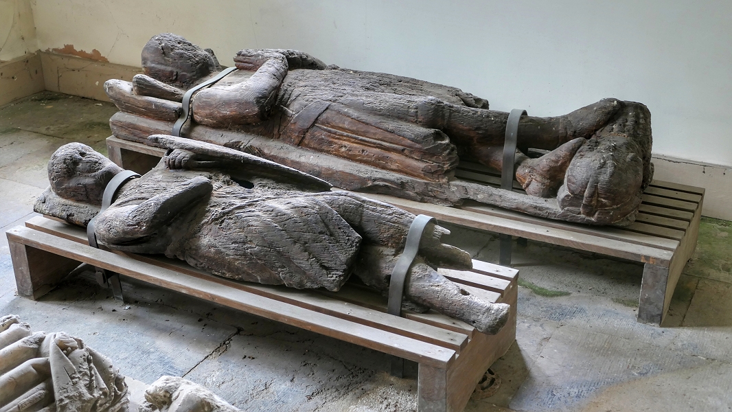 St Martin's, Allerton Mauleverer: hölzerne Grabskulpturen zweier Ritter aus dem späten 13. oder frühen 14. Jahrhundert ...