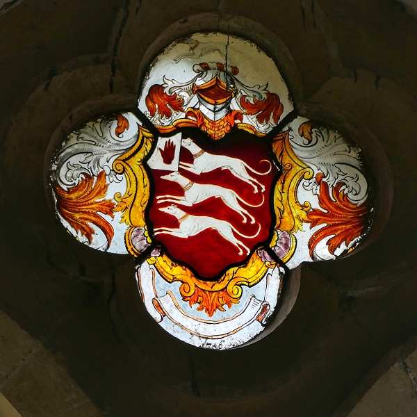 St Martin's, Allerton Mauleverer: Buntglasfenster mit dem Wappen der Familie Mauleverer von Allerton Castle ...
