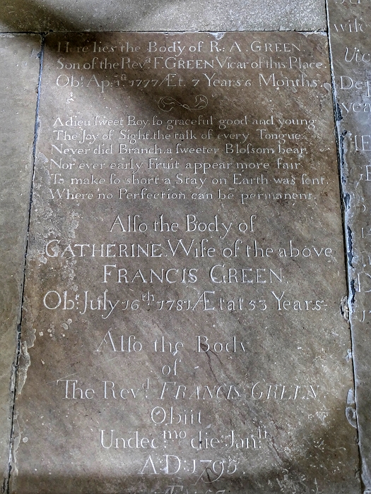 Sohnes des Vikars von North Grimston. Die Grabplatte trägt eine