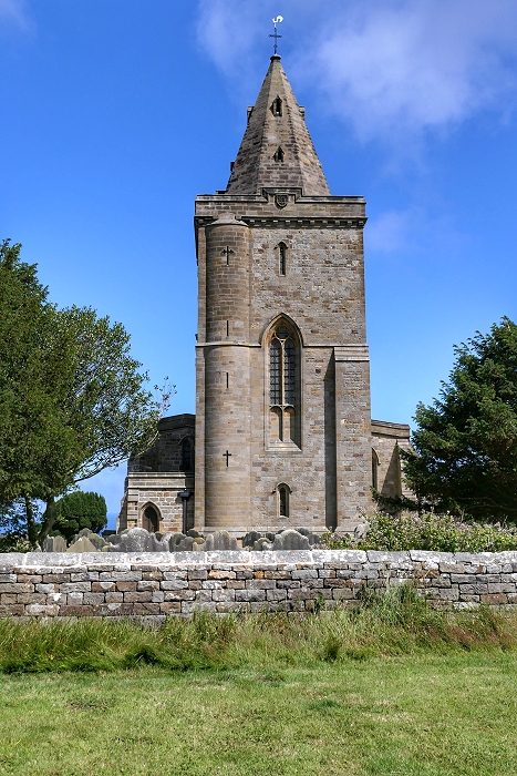 Im Zuge des Neubaus der Kirche St Oswald wurde auch der normannische Turm dahingehend umgebaut, dass man eine Turmspitze aufsetzen konnte ...