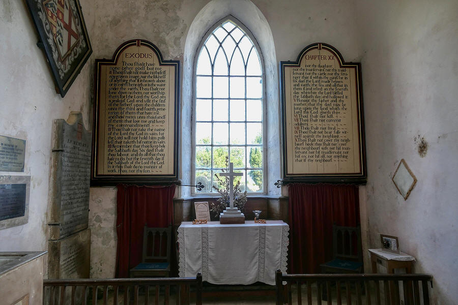 Altarraum der Kirche Old St Stephen's in Fylingdales mit Schrifttafeln der 10 Gebote ...