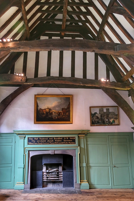 York, Merchand Adventurers Hall: Eine Inschrift über dem Kamin erinnert an die Renovierung der Großen Halle unter dem Vorsitzenden Joseph Kimber im Jahre 1849 ...