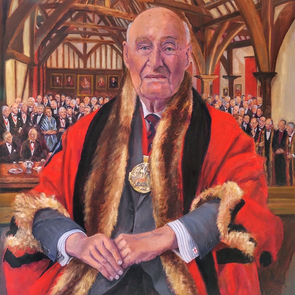 Portraits ehemaliger Vorsitzender der Gilde in der Großen Halle der Merchant Adventurers Hall: Sir Donald James Barron (1897), Mitbegründer der Universität von York ... | |