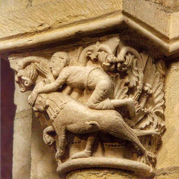 Daniel in der Löwengrube: Figurenkapitell in der Priorei St. Trinité in Anzy-le-Duc ...