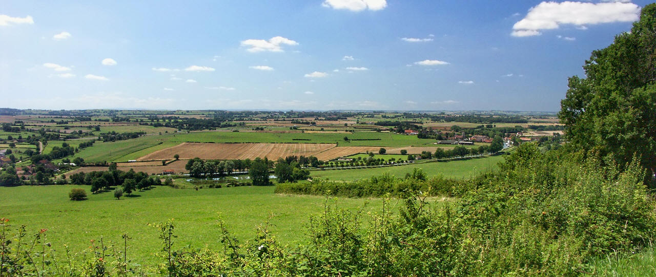 Blick von Châteauneuf-en-Auxois über den Kanal von Burgund auf die Landschaft des Auxois ...