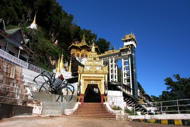 Eingang zu den Höhlen von Pindaya. Der Legende nach wurden in den Höhlen sieben Prinzessinnen von einer riesigen Spinne gefangen gehalten, bis ein zufällig vorbeikommender Prinz sie befreite ... | |