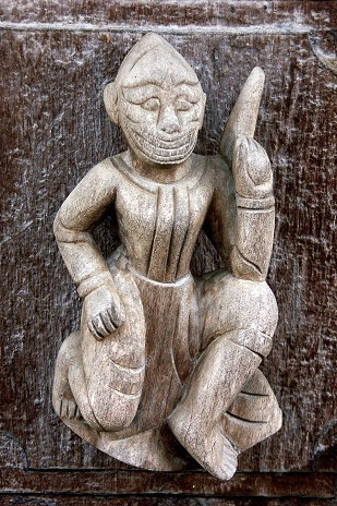 Die Wände des Shwenandaw Klosters sind mit kunstvoll geschnitzten Figuren verziert ...