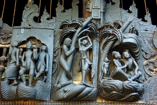 Die hölzernen Außenwändes des Youqson Kyaung sind über und über mit detailgenauen Schnitzereien bedeckt, die Szenen aus dem höfischen Leben zeigen ... | |