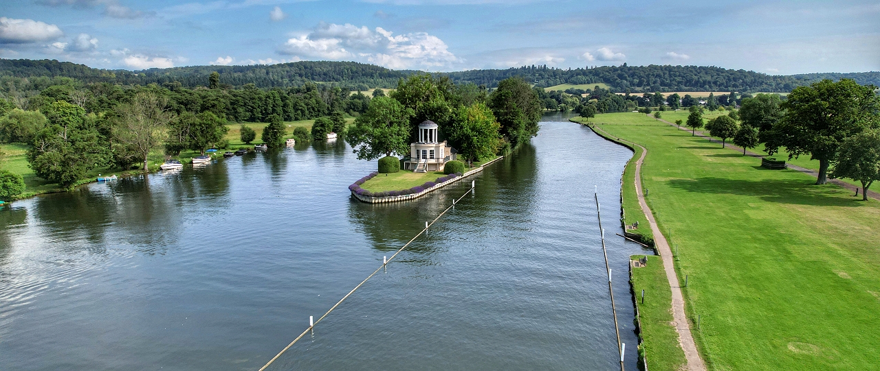 Folgt man der Themse von Fawley Court aus wenige hundert Meter flussabwärts, so stößt man auf die kleine, schmale Insel Temple Island ... | |