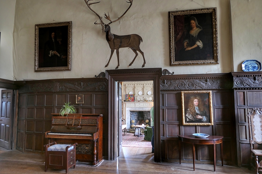 Ein seltener Anblick ist die Kombination aus Jagdtrophäe und Wandmalerei in der Eingangshalle von Chastleton House ...