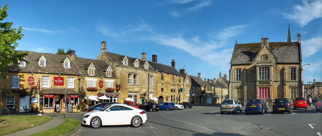 Stow-on-the-Wold (hier der Marktplatz) mit seinen zahlreichen Antiquitätenläden ist das geografische und touristische Zentrum der Cotswolds ... | |