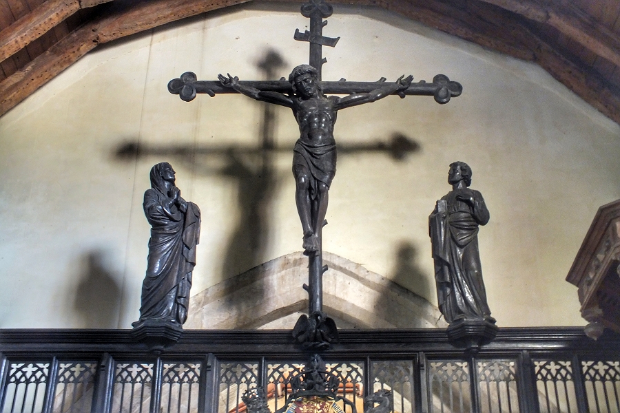 Geschnitzte Kreuzigungsgruppe auf der Chorschranke in der Kirche von Stanton ...