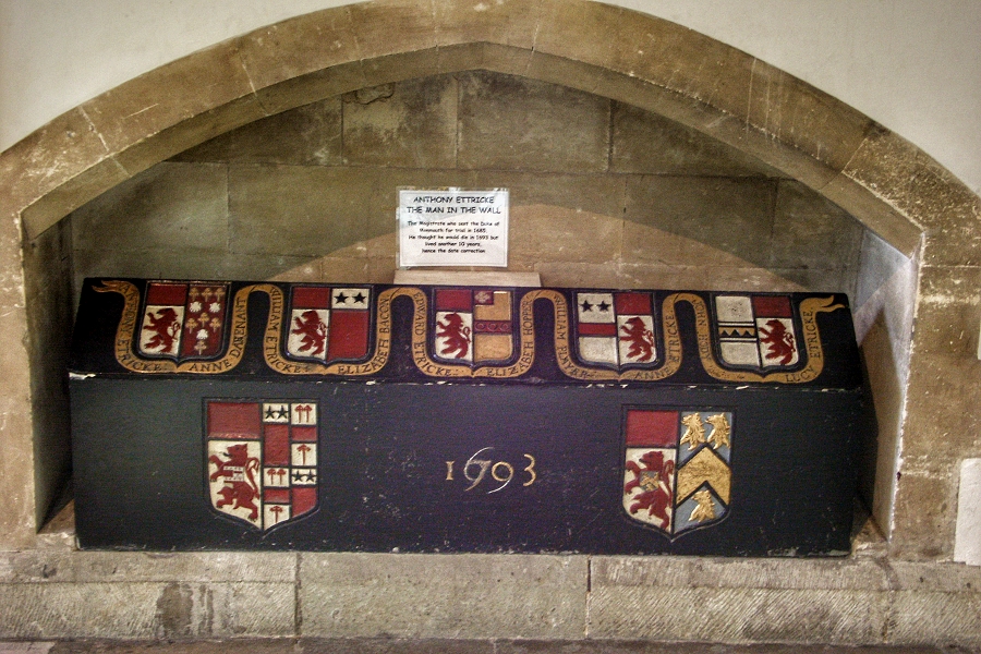 The 'Man in the Wall': Anthony Etricke ließ sich in der Wand der Kirche von Wimborne Minster beisetzen. Seine Überzeugung, er werde 1693 sterben, bewahrheitete sich aber nicht. Er starb erst im Jahre 1703 ... | |