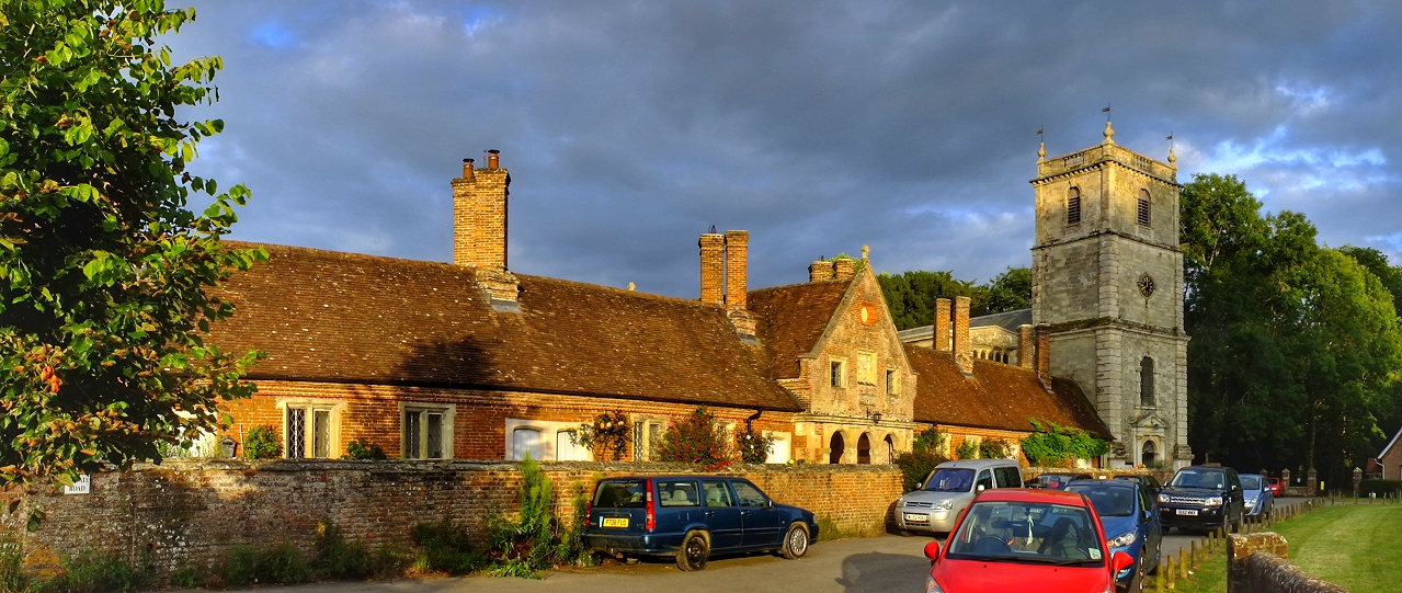 Wimborne St. Giles: Kirche und Almshouses im Licht der untergehenden Sonne ...