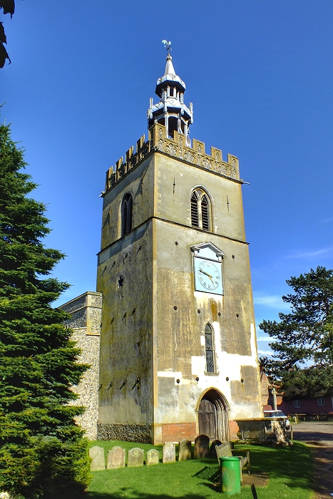 Der Turm der Dorfkirche von Shipdham trägt die für Kirchen in Norfolk typische 'Krone' ...