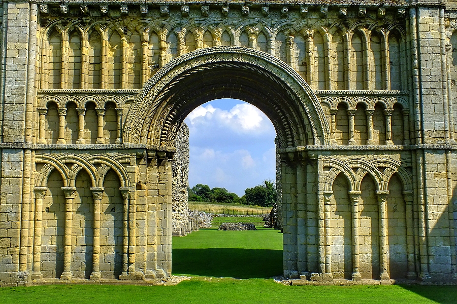 Romanische Westfassade der Abteikirche von Castle Acre ...