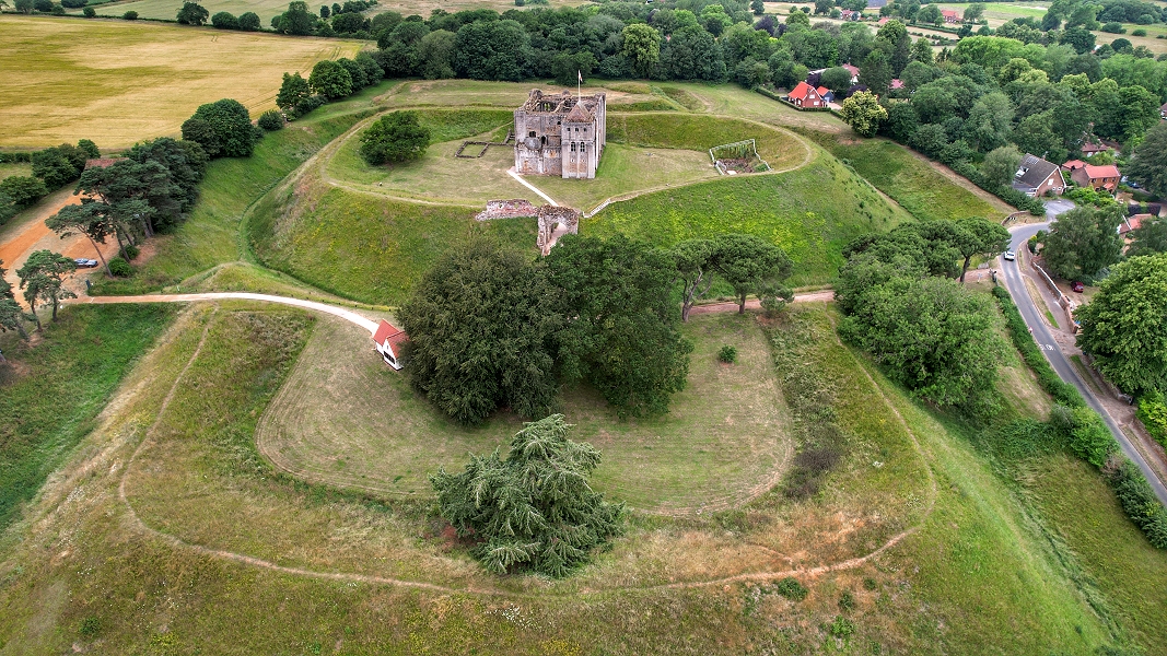 Aus der Luft ist die ursprüngliche Anlage von Castle Rising mit Vorburg und Burg noch gut zu erkennen ...