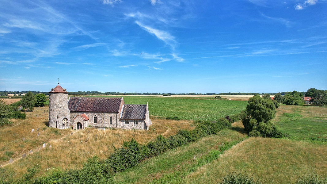 Die Kirche St. Andrew's von Little Snoring liegt auf einer Anhöhe in den Feldern an der Straße nach Walsingham ...