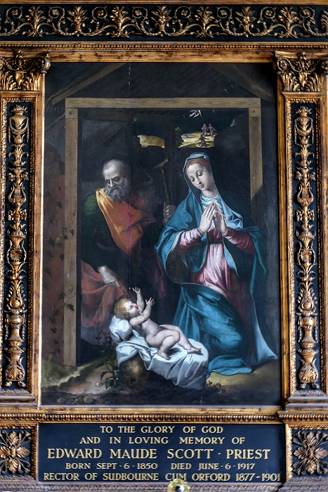 St Bartholomew's, Orford: Gemälde über dem Hauptaltar mit einer Darstellung der heiligen Familie (Barnardino Luini, italienischer Maler, +1532 in Mailand) ...